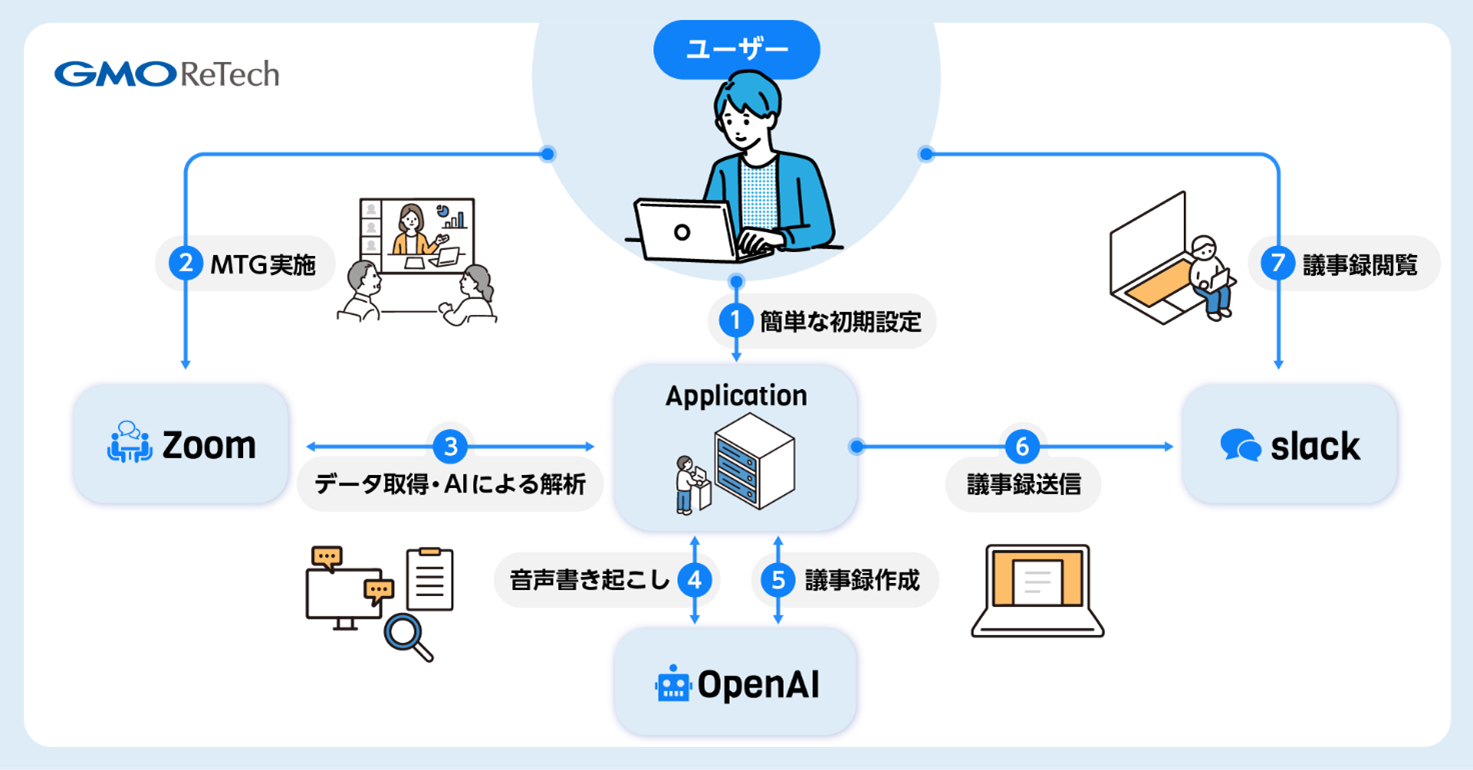 本システムでは、商談や社内の会議終了後の「Zoom」の音声データを読み込み「ChatGPT」へと連携することで、詳細な議事録を自動的に作成し、GMO ReTechが使用するコミュニケーションツールの「Slack」の指定したチャンネルに自動投稿する機能を備えています。