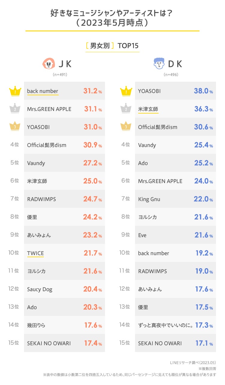 ■好きなミュージシャンは女子高生では「back number」、男子高生では「YOASOBI」が1位