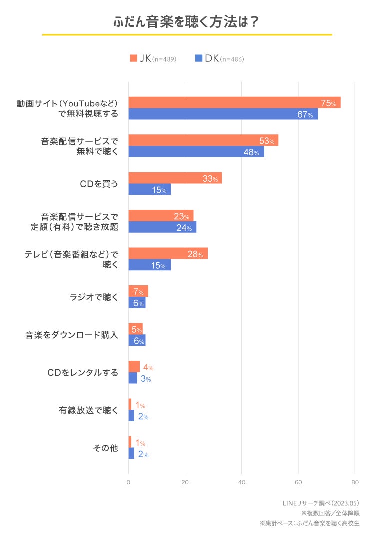 【LINEリサーチ】ふだん音楽を聴く方法は「動画サイト(YouTubeなど)で無料視聴する」が1位 高校生の好きなミュージシャンは「YOASOBI」が1位