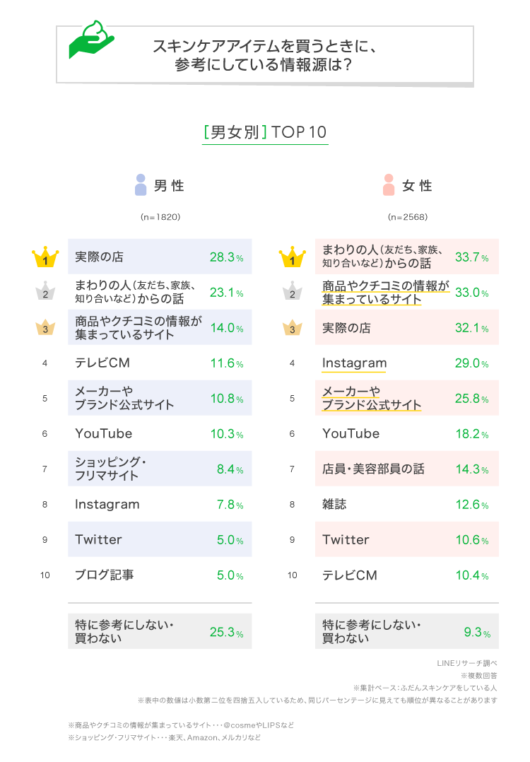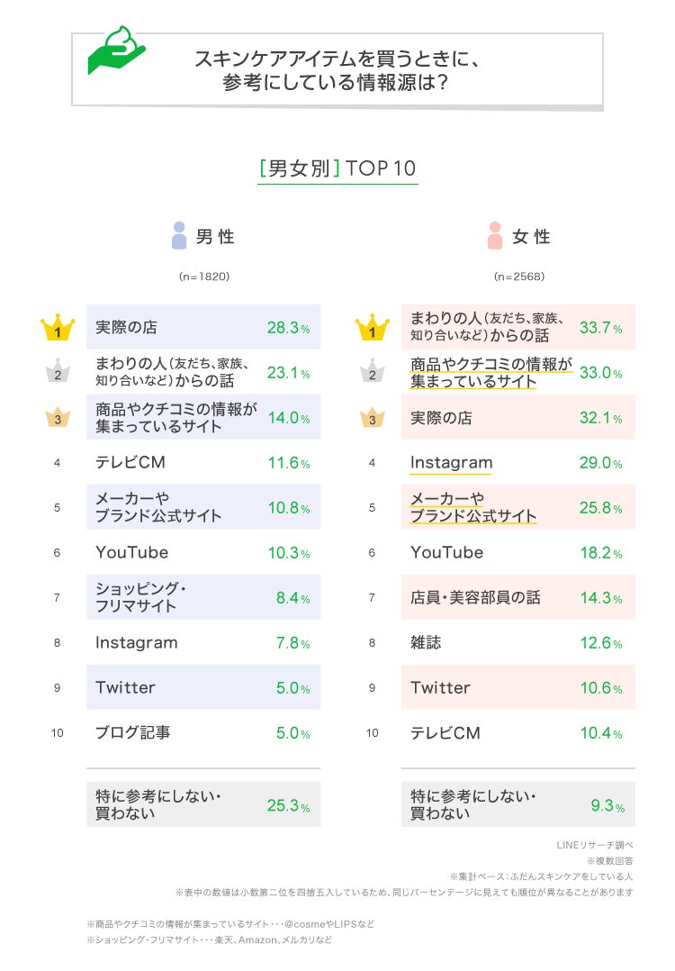【LINEリサーチ】スキンケアアイテムを買うときに参考にしている情報源は「実際の店」「まわりの人からの話」が上位、10代~30代女性は「Instagram」が1位