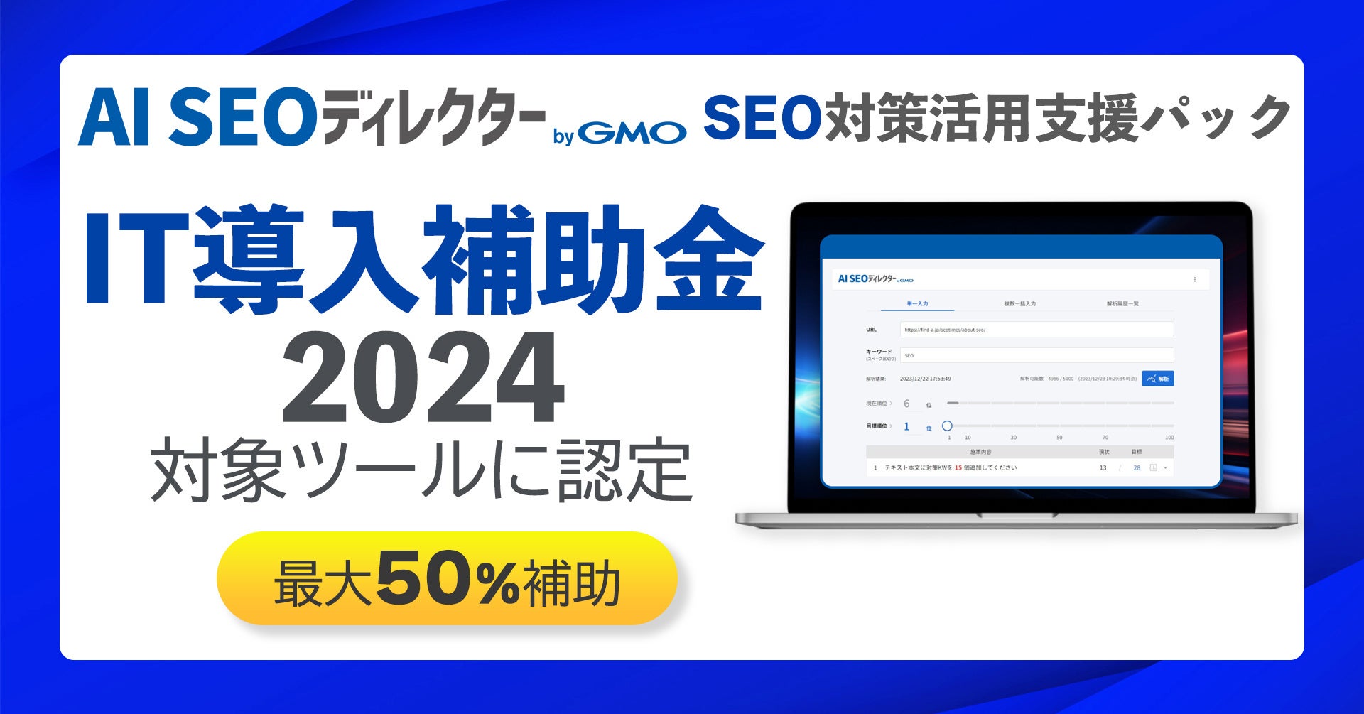 SEOの包括的ソリューション「AI SEOディレクターSEO対策活用支援パック」、「IT導入補助金2024」の対象ツールに認定【GMOソリューションパートナー】