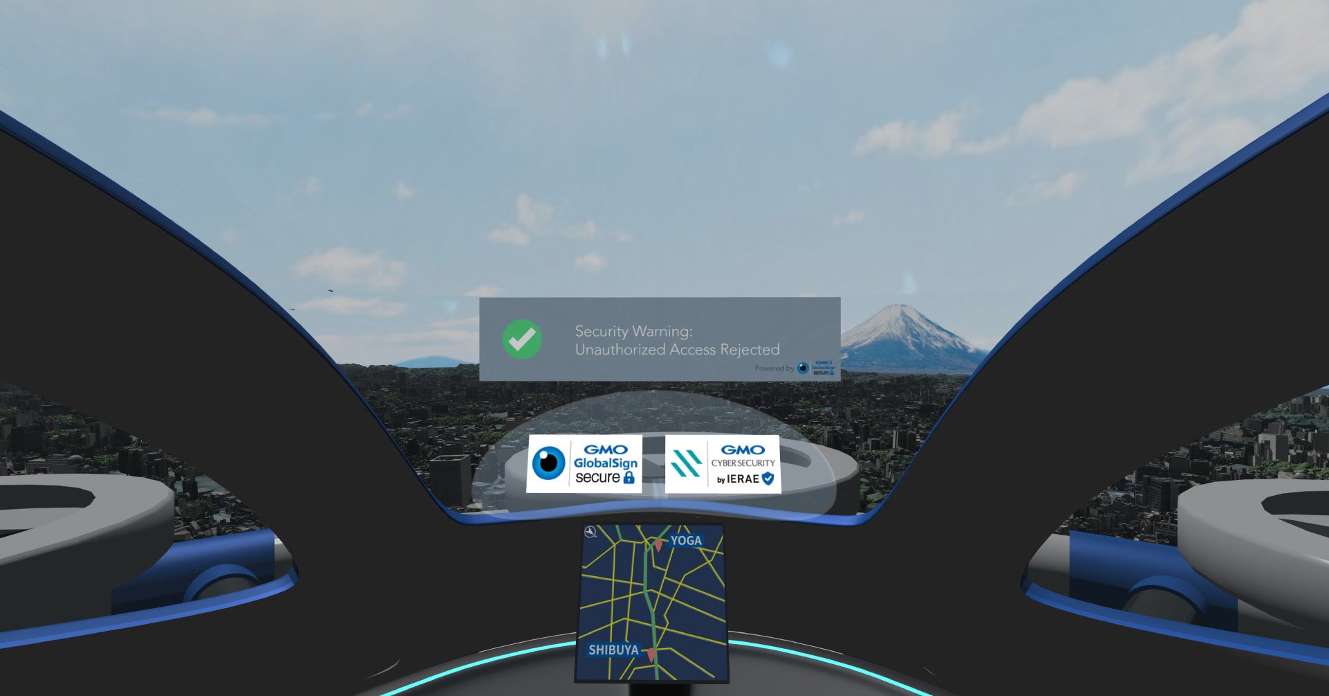 出展ブースでは、来場者の皆様に空飛ぶクルマが社会実装された世界を、VR映像を通じて体感いただきます。VR映像では、空飛ぶクルマに乗り込み、GMOインターネットグループの本社がある東京・渋谷から、GMOインターネットTOWERがある用賀へ飛行します。VR映像では、東京の街並みを空からご覧いただき、空飛ぶクルマが実装された世界観を体感いただくのと同時に、その前提となる空の安全の確立に向けたセキュリティの重要性をお伝えいたします。空飛ぶクルマの普及において、最大のリスクはサイバー攻撃による墜落事故です。機体を制御する通信が攻撃された場合、乗客や地域住民の命に関わる墜落事故が起きると懸念されます。また、通信を乗っ取られた空飛ぶクルマが重要な施設への攻撃に使われる可能性も指摘