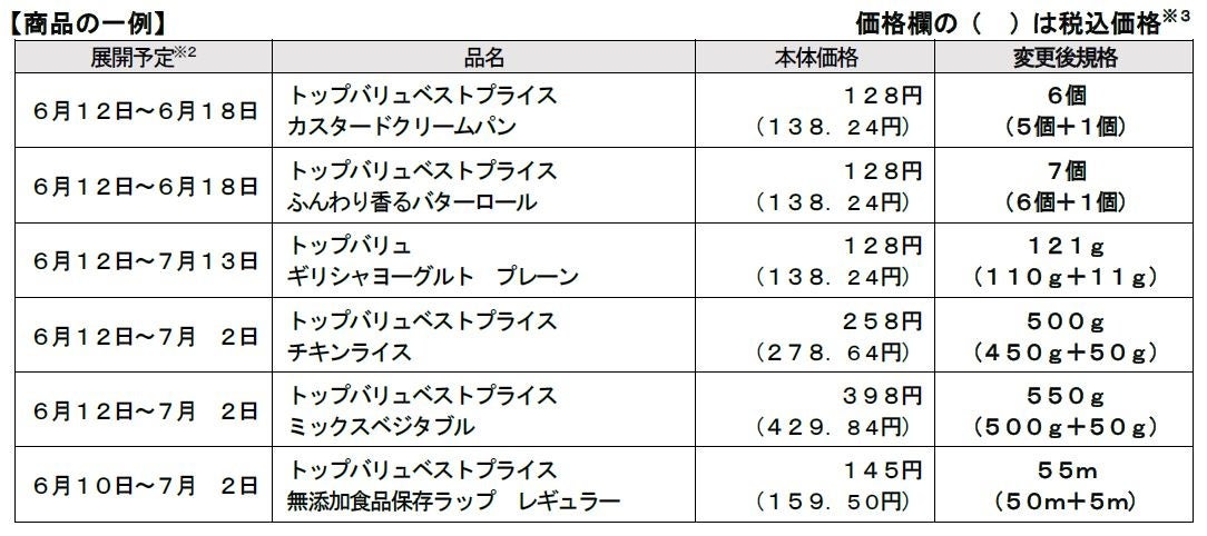 イオンは6月10日(月)より順次、「イオン」「イオンスタイル」「マックスバリュ」など全国約10,000店舗にて、「パン」「ヨーグルト」「食品保存ラップ」など暮らしの中で利用頻度の高い商品を中心に、合計52品目※1の増量企画を実施します。