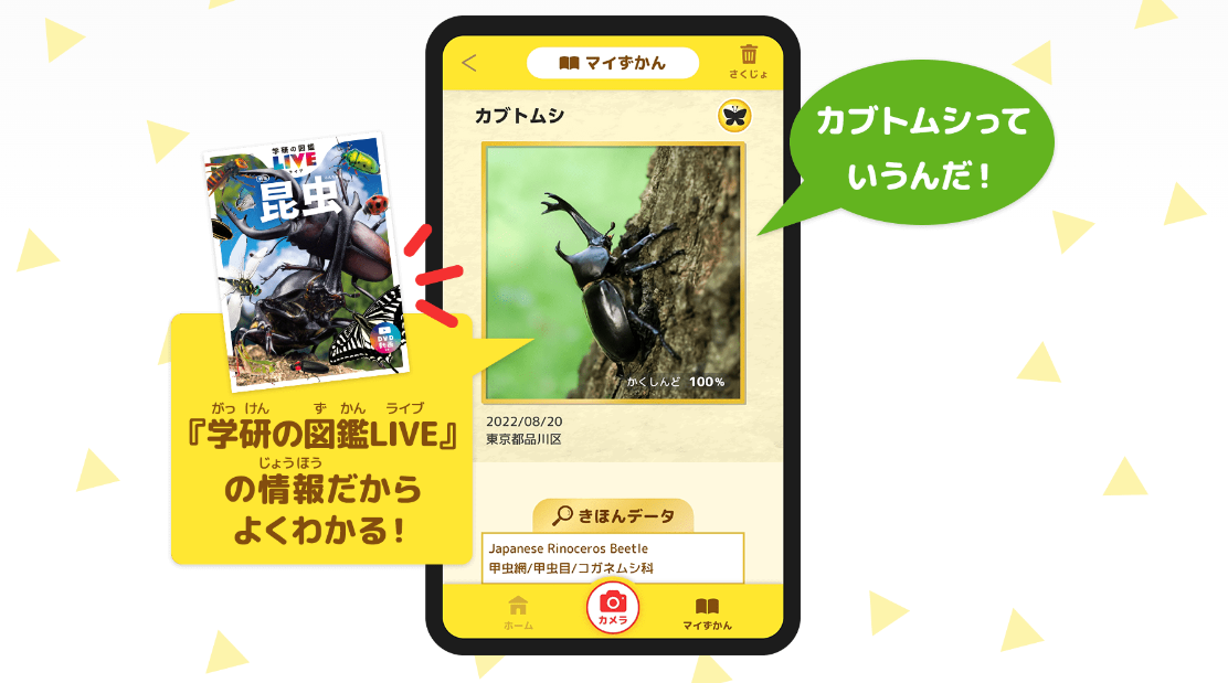 撮影した写真は「マイずかん」に保存されます。たくさん撮って、世界にひとつの自分だけの図鑑をつくりましょう。