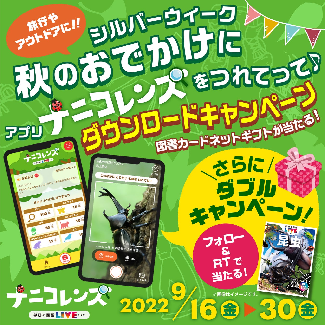 - ①秋のおでかけに! 無料のAI図鑑アプリ『ナニコレンズ』を新規ダウンロード&1度でも撮影に成功した方に豪華賞品があたるキャンペーンを実施!