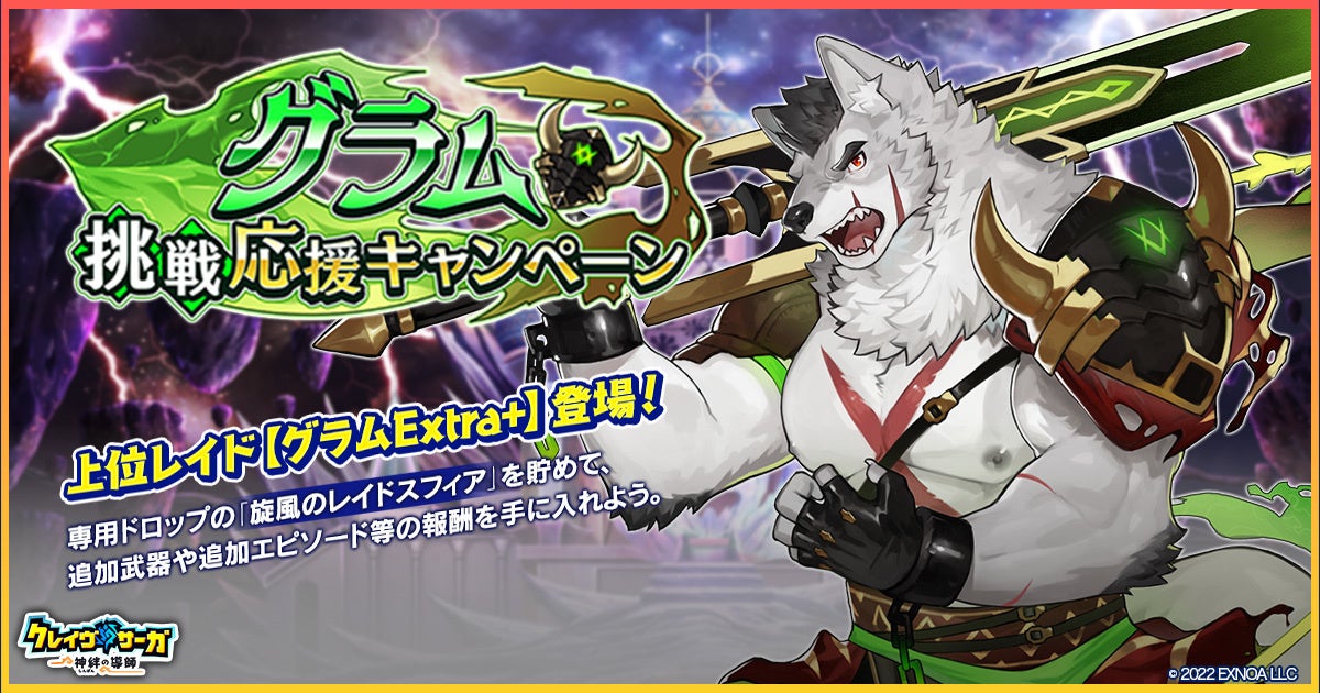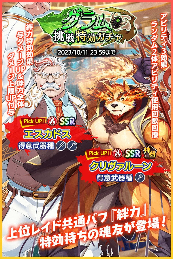 Extra+のレイド攻略に有効な特効スキル持ちのSSR魂友「エスカドス」とSSR神器「クリヴァルーン」がピックアップされた「グラム挑戦特効ガチャ」をお見逃しなく。