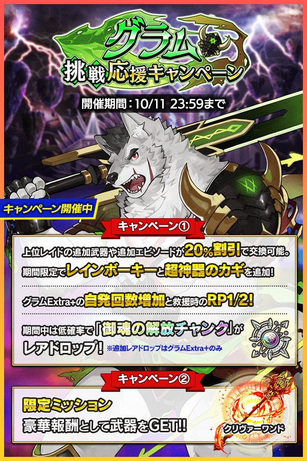 キャンペーン期間中はレイド救援時の消費RPが半減するほか、グラムExtra+の挑戦回数が2回増加いたします。さらに交換所の一部アイテムが20%割引で交換可能!