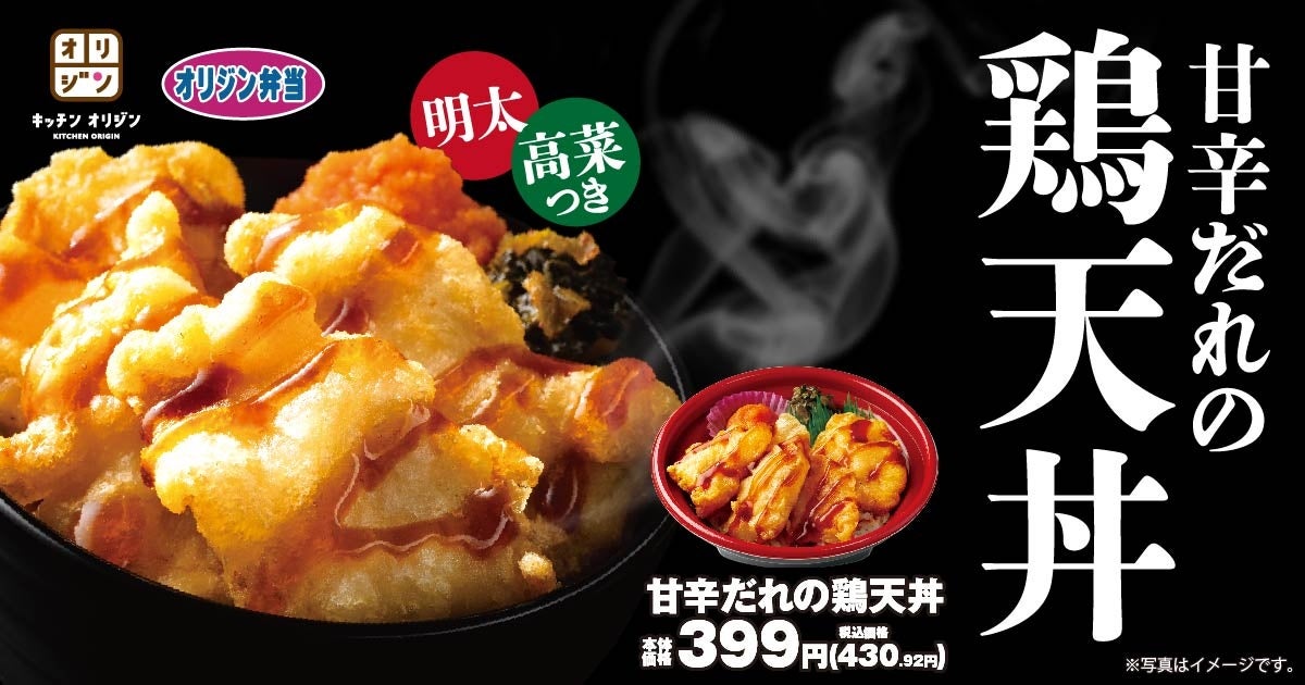弁当・惣菜専門店「キッチンオリジン」「オリジン弁当」を展開しているイオングループのオリジン東秀株式会社(本社:東京都調布市/代表:後藤 雅之)は、6月12日(水)10時より、「甘辛タレの鶏天丼~高菜・明太つき~」を期間限定で発売いたします。