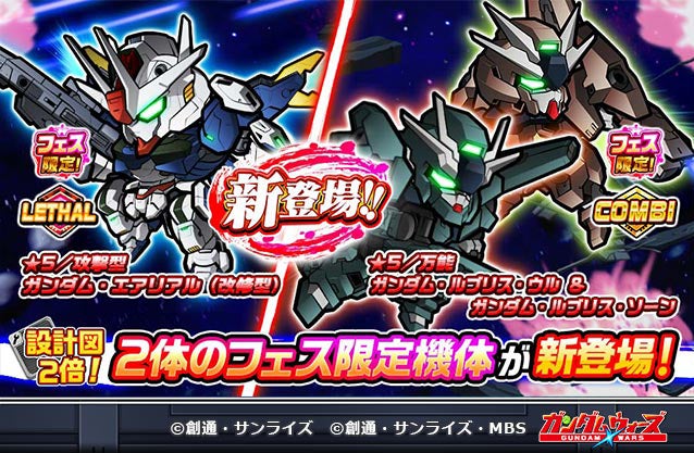 期間中、新機体として、「ガンダム・エアリアル(改修型)」や「ガンダム・ルブリス・ウル&ガンダム・ルブリス・ソーン」、 「ミカエリス」、「ベギルペンデ」が登場するガシャを開催します。PV公開の翌日6月24日から「ミカエリス」が登場する期間限定ガシャを開始し、「ベギルペンデ」が連携機体として登場する月初イベント応援ガシャを6月28日より開始します。そして、同日6月28日開始ガシャのSWGFにて「ガンダム・エアリアル(改修型)」と「ガンダム・ルブリス・ウル&ガンダム・ルブリス・ソーン」が登場!「ガンダム・エアリアル(改修型)」は強力なリーサル必殺技を持ち、「ガンダム・ルブリス・ウル&ガンダム・ルブリス・ソーン」はバトル中に機体を切り替えて戦う「コンビ」の機体です。