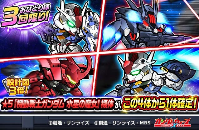 期間中、以前に実装済みの「ガンダム・エアリアル(ミラソウル社製フライトユニット装備)」や「ガンダム・ファラクト」、「ダリルバルデ」、「ガンダム・エアリアル」が登場するガシャを開催します。おひとり様3回までの回数限定ガシャで、毎回これら★5機体4体からいずれか1体が確定で獲得できますので、この機会をお見逃しなく!