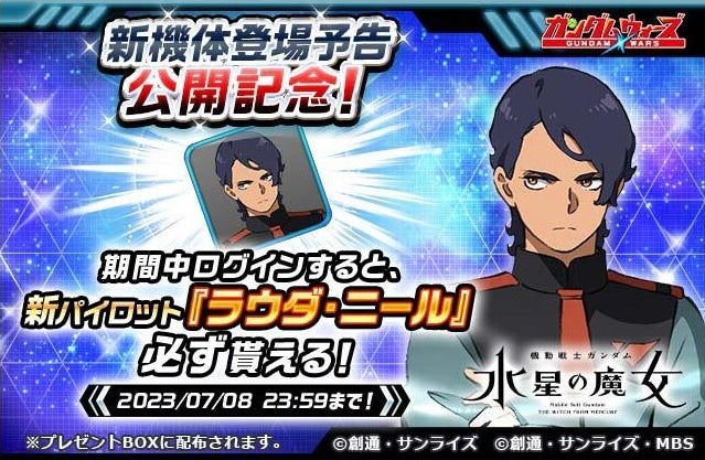 期間中、ログインすることで、新規パイロット「ラウダ・ニール」をプレゼントします。7月8日までの期間限定ですので、忘れずにプレゼントBOXからお受け取りください。