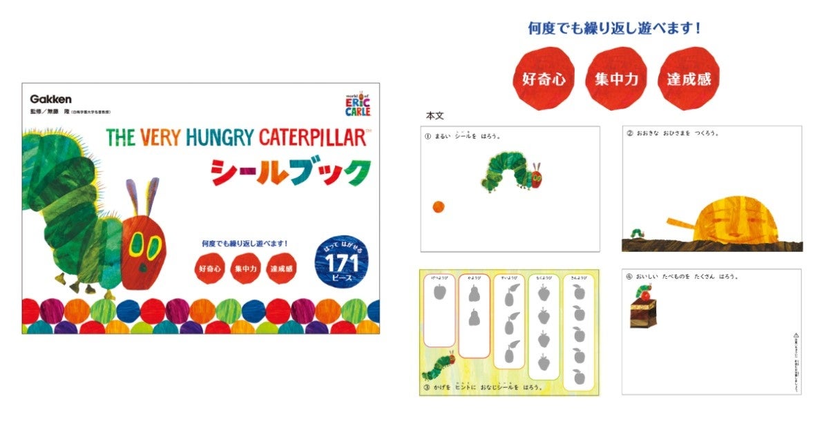 「はらぺこあおむし」のシールブックでは、【りんご】や【なし】のシールをはったり、シールをはってきれいなちょうちょを完成させたり・・・絵本のストーリーにあわせたシール遊びをすることができます。