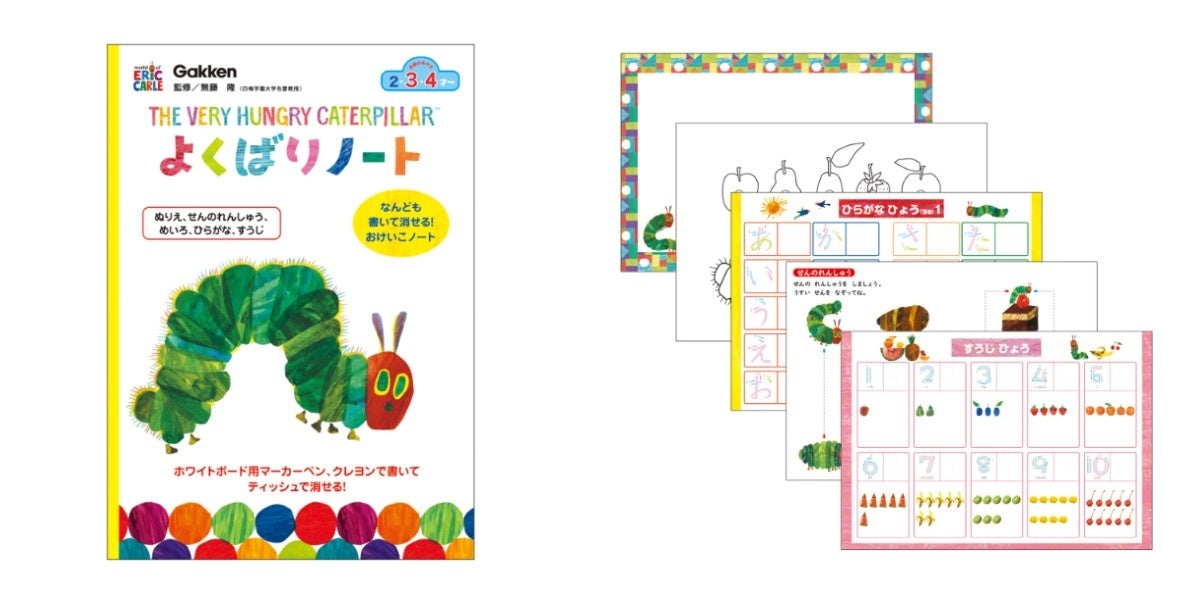 「はらぺこあおむし」のよくばりノートは、スタートとゴールを結んだり、線をなぞったりする運筆の練習ページがたっぷりあり、書くことを楽しめる内容に。ステップアップしてひらがなや数字も練習できます。
