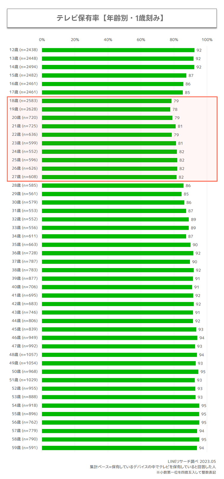 前項で持っているデバイスの中でもっとも割合の高かった「テレビ」の保有率について、年齢を1歳刻みでみていきます。