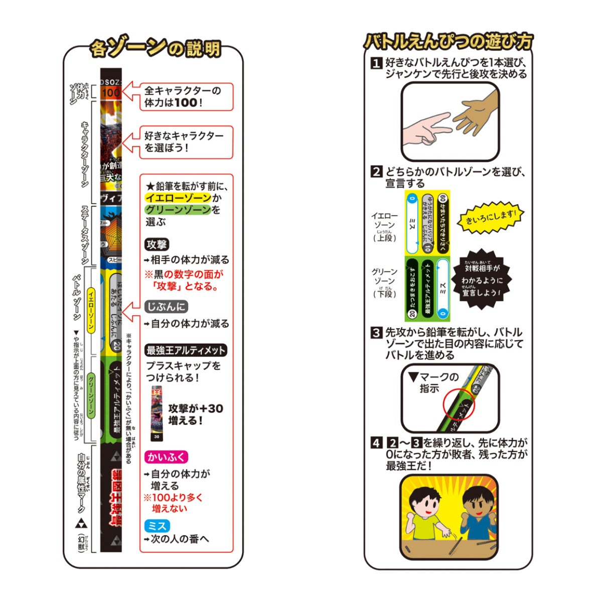 鉛筆を転がし、出た面の内容に応じてバトルをすすめ、相手の体力を0にしたほうが勝利となるゲームです。