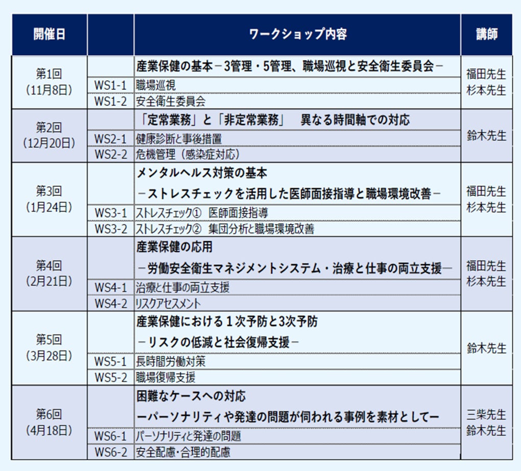 毎年、受講者からご好評をいただいている「産業医即戦力要請コース」は、今年で4回目を迎えます。帝京大学大学院公衆衛生学研究科の協力のもと、講義とワークショップの5回コースで開催していた従来の内容を、今年は6回コースとしてさらに充実いたします。追加される6回目は、労働法・産業保健法の第一人者で、職場の安全と健康に関する法が専門の近畿大学法学部の三柴丈典教授を講師に迎え、企業の産業保健を担う産業医として認識しておくべき法務知識をテーマに講義とワークショップで構成し、実践力の強化をはかります。