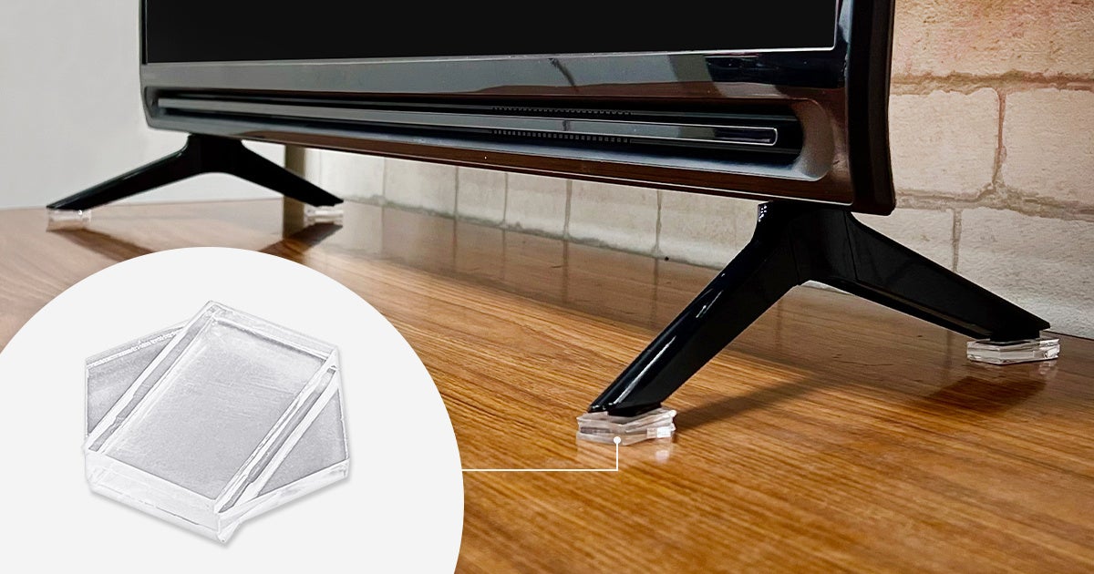 接地面の狭いテレビの台座にも対応、テレビ脚に貼り付けて強力粘着固定できる耐震ストッパーを発売