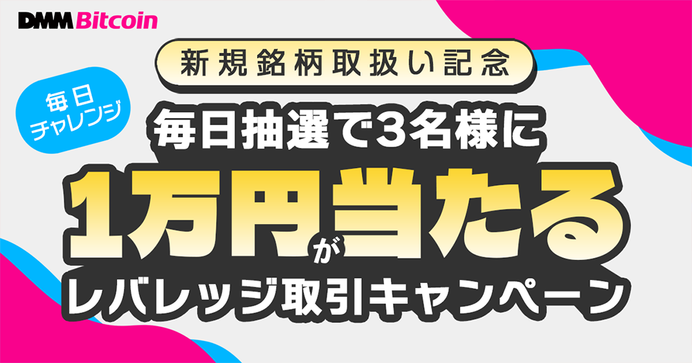 開催期間中に、レバレッジ取引にて1日に合計50,000円以上の暗号資産の新規注文(約定)をされたお客様の中から毎日抽選で3名様に10,000円をプレゼントいたします。