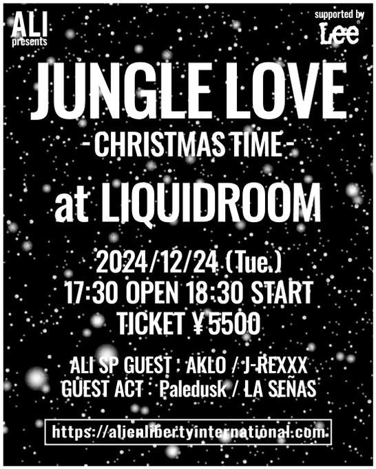 さらにALIは12月24日に恵比寿LIQUIDROOMにて自主企画ライブ「JUNGLE LOVE-CHRISTMAS TIME-Supported by Lee」を実施することが決定。ゲストアクトにPaleduskとLA SEÑAS、ALIのゲストとしてAKLO, J-REXXXを招き、3マンライブを開催する。チケットは好評発売中。