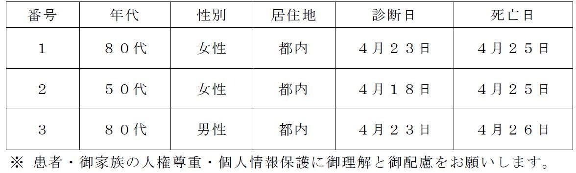 都内で新型コロナウイルスに感染した方が死亡されましたのでお知らせします。