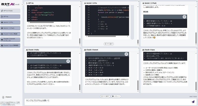 ▲『教えて AI 一発検索』 プロンプトを 6 つの AI モデルで同時に実行