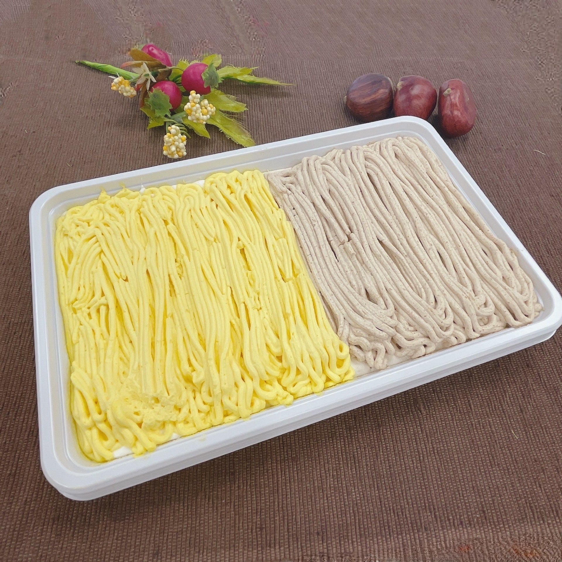 スポンジの上に2種類のモンブランクリームをトッピングした大きくてインパクトのあるモンブランです。栗の風味を感じる渋皮栗のモンブランクリームと、栗の甘みをダイレクトに感じる黄栗のモンブランクリームを好みによって味わえる仕立てです。ご家族でシェアしても、大満足できるモンブランになっています。