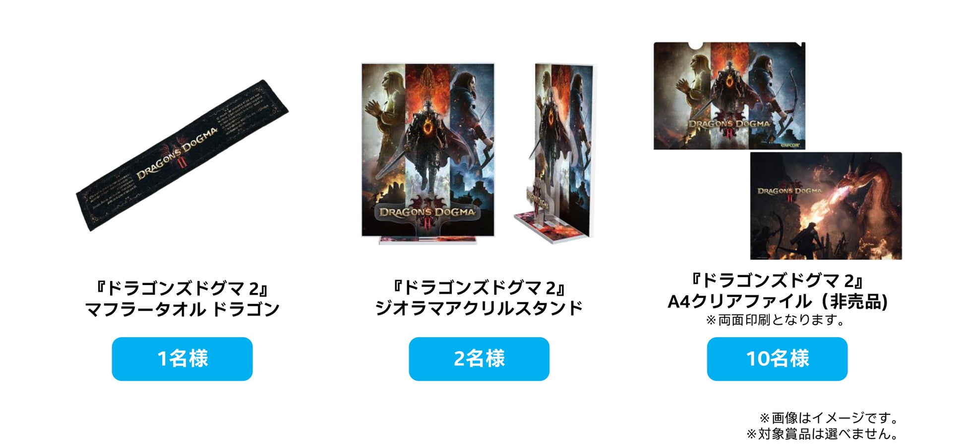 さらに、ダブルチャンスとして本キャンペーンにご参加いただいた(応募者)全員の中から、抽選で13名様に『ドラゴンズドグマ 2』のオリジナルグッズをプレゼントします。