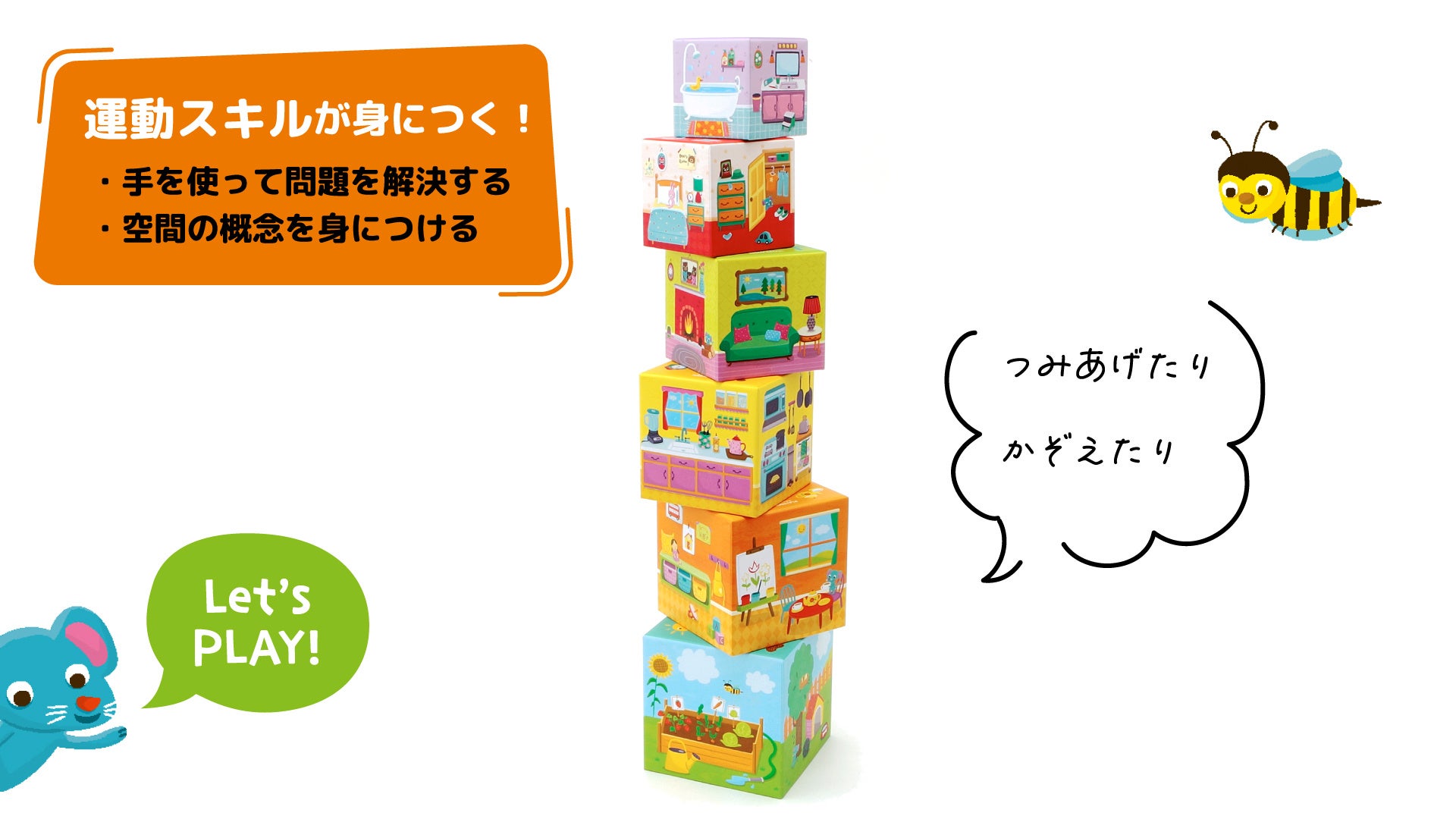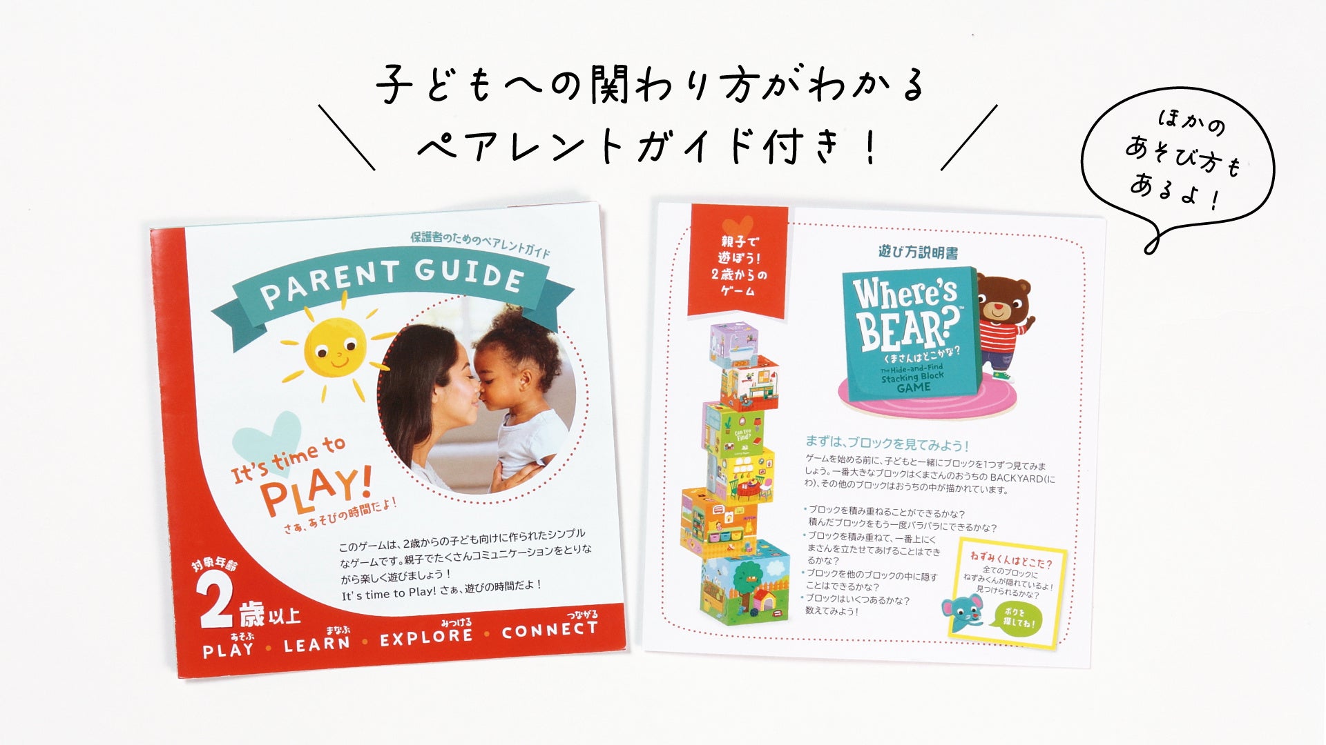 アメリカで大人気の知育玩具が上陸! 世界的なおもちゃ賞として有名なオッペンハイム・トイ・アワードで「プラチナトイアワード」を受賞した玩具です。6つのブロックとくまの人形を使って、積み重ねたり、くまさん探しをしたり、お話を作ったり…親子で仲良く会話しながら繰り返し遊ぶことで、昨今、豊かな人間形成に欠かせないといわれる「非認知能力」を育むことにつながります。
