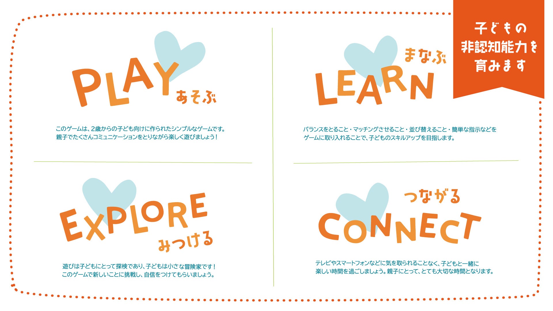 アメリカの幼児教育の専門家が商品監修を行っており、付属のペアレントガイドには子どもへの関わり方についてのアドバイスが記載されています。最も大切なのはテレビやスマートフォンから離れて親子で仲良く会話しながら遊ぶ時間をつくること。そして、その親子のコミュニケーション自体が、粘り強く頑張る力、自己を抑制する力などの「非認知能力」を育むことにつながります。「非認知能力」は感情や情緒から引き起こされるもので、「豊かな人間形成に非常に重要だといわれている力」。昨今、海外や日本の幼児教育の現場で重要視されているスキルです。