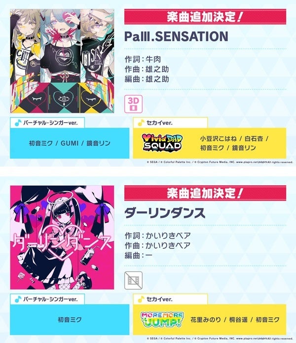 新たなリズムゲーム楽曲として、「PaⅢ.SENSATION」(作詞:牛肉、作曲:雄之助)、「ダーリンダンス」(作詞・作曲:かいりきベア)の追加が決定いたしました。