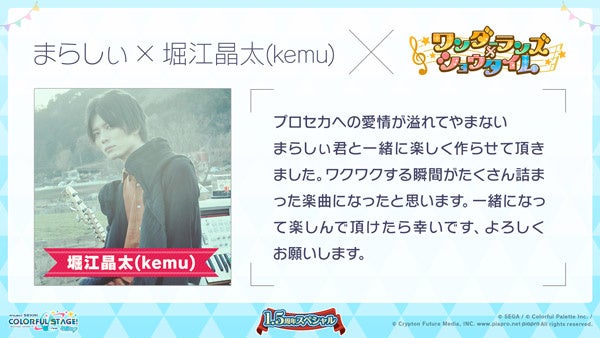 また、新たな書き下ろし楽曲提供クリエイターとして、まらしぃさん・堀江晶太(kemu)さん、傘村トータさんの参加が決定いたしました。そのほか、『プロジェクトセカイ』のサービス開始1.5周年を記念した新情報を多数発表いたしました。