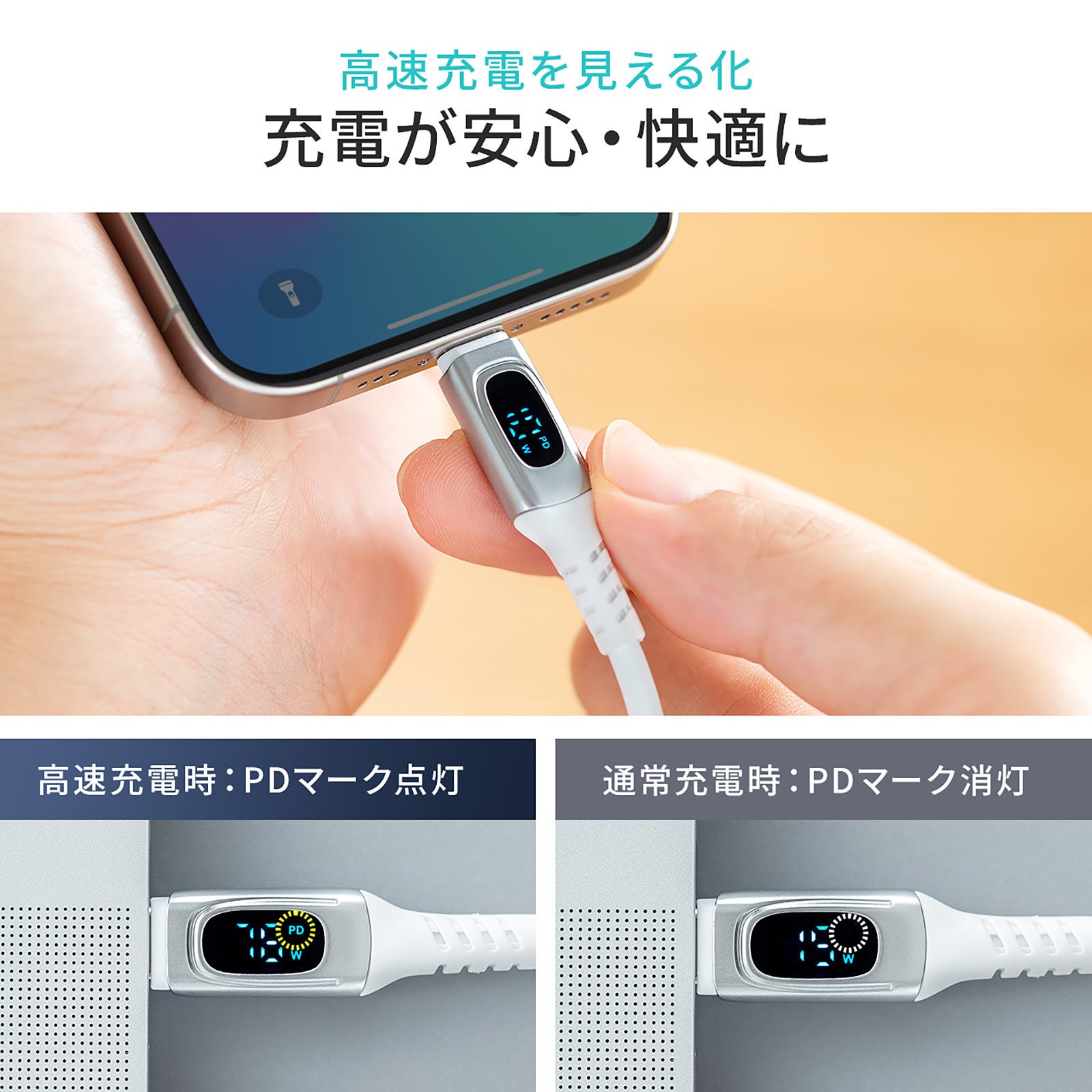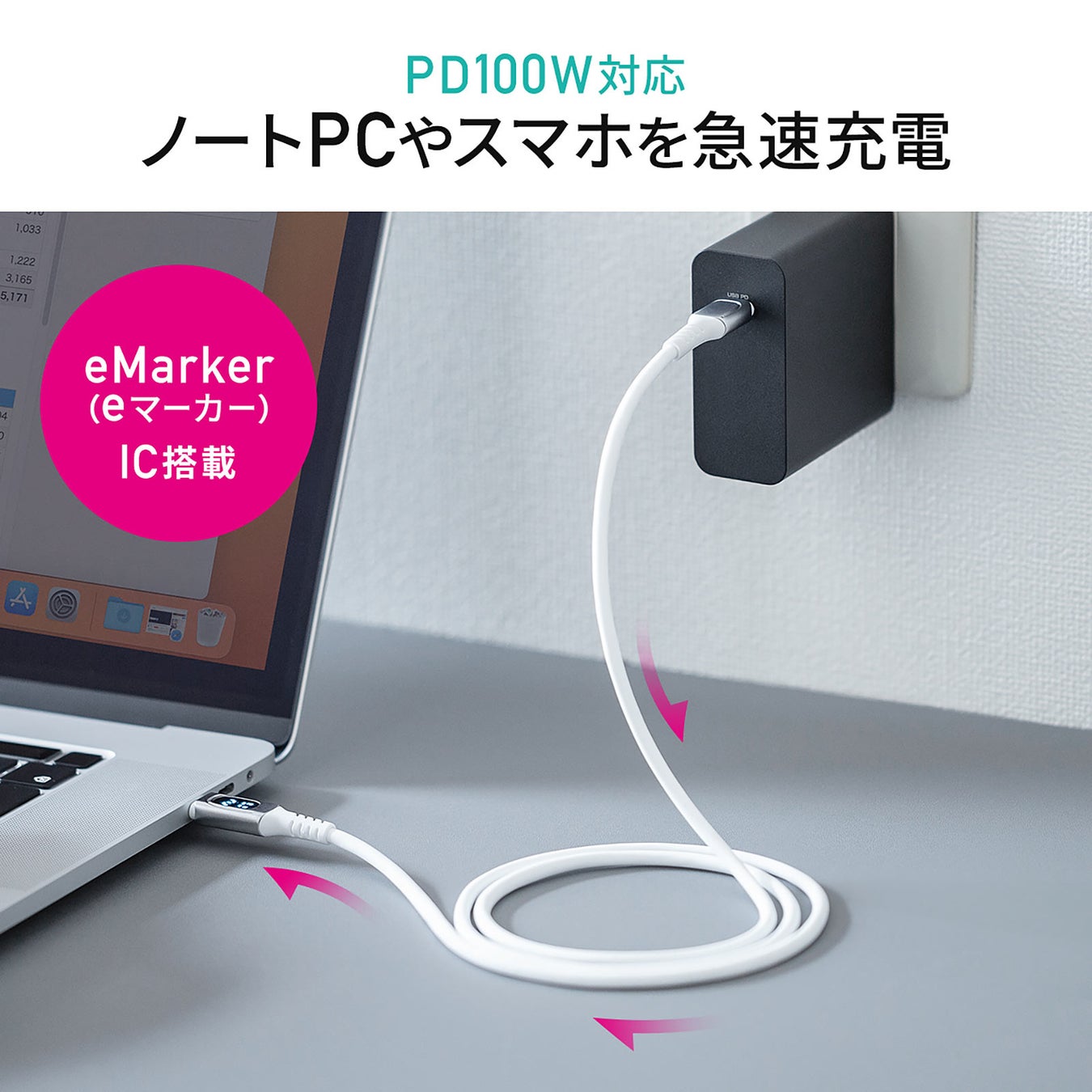 PD電力表示機能付き USB Type-Cケーブル USB PD100W対応 e-marker搭載 1m やわらかシリコンケーブル USB2.0 充電 データ転送 スマホ タブレット ホワイト