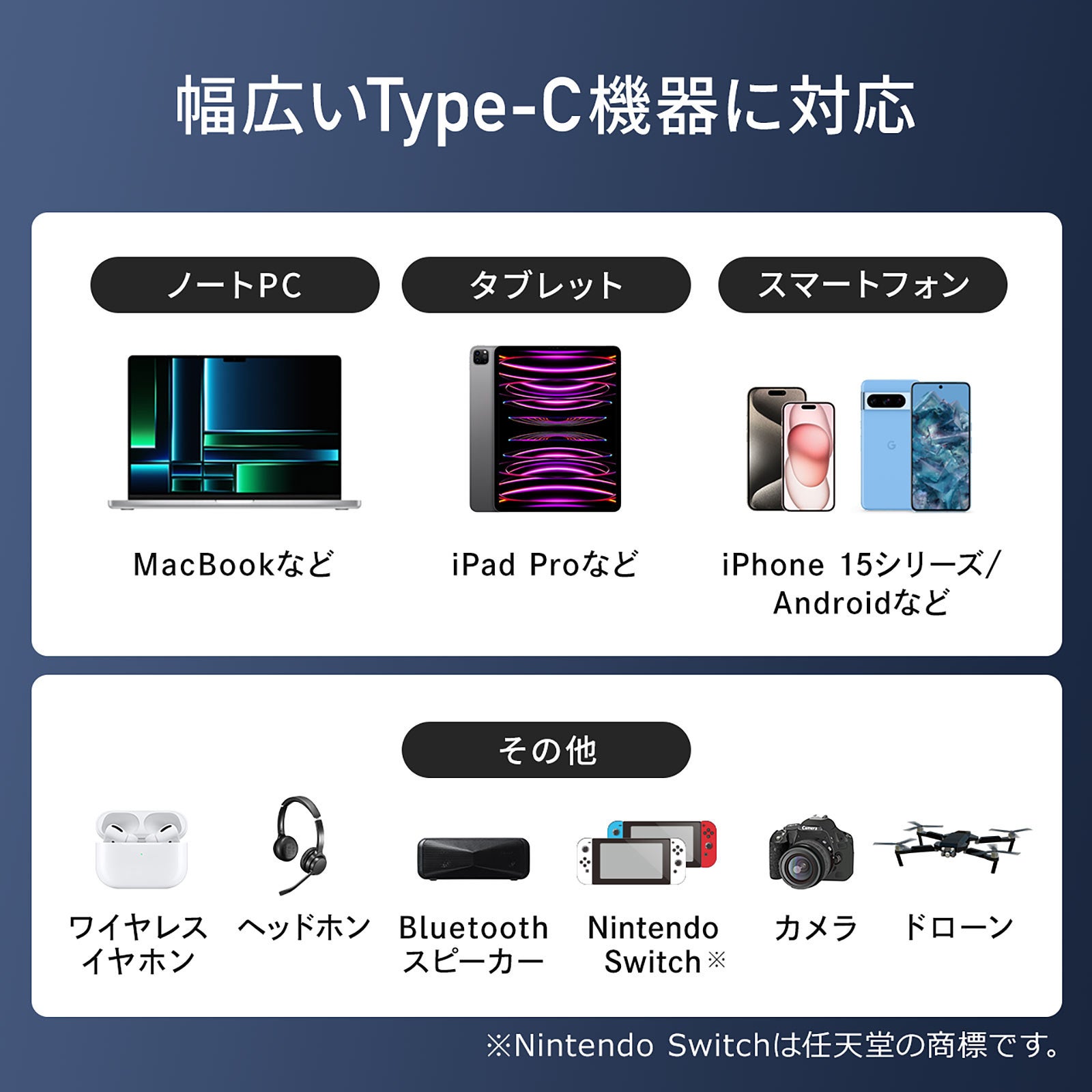 USB Type-Cポートを搭載した機器と接続し、充電やデータ転送をする事ができます。eMarker(専用チップ)をコネクタ内に搭載しており、安定した電源供給ができます。