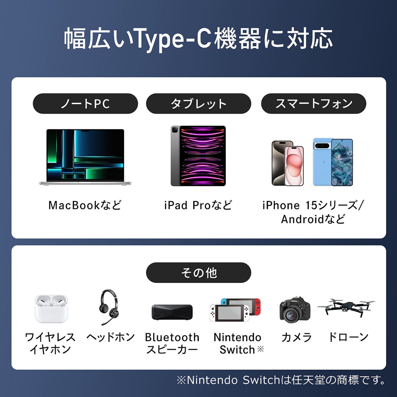 USB Type-Cでの「USB Power Delivery(USB PD)」に対応しており、環境では500-USB077は、最大100W(DC20V/5A)、500-USB078は、最大240W(DC48V/5A)の電源供給が可能です。※供給電源はPD対応の機器や電源の仕様により異なります。