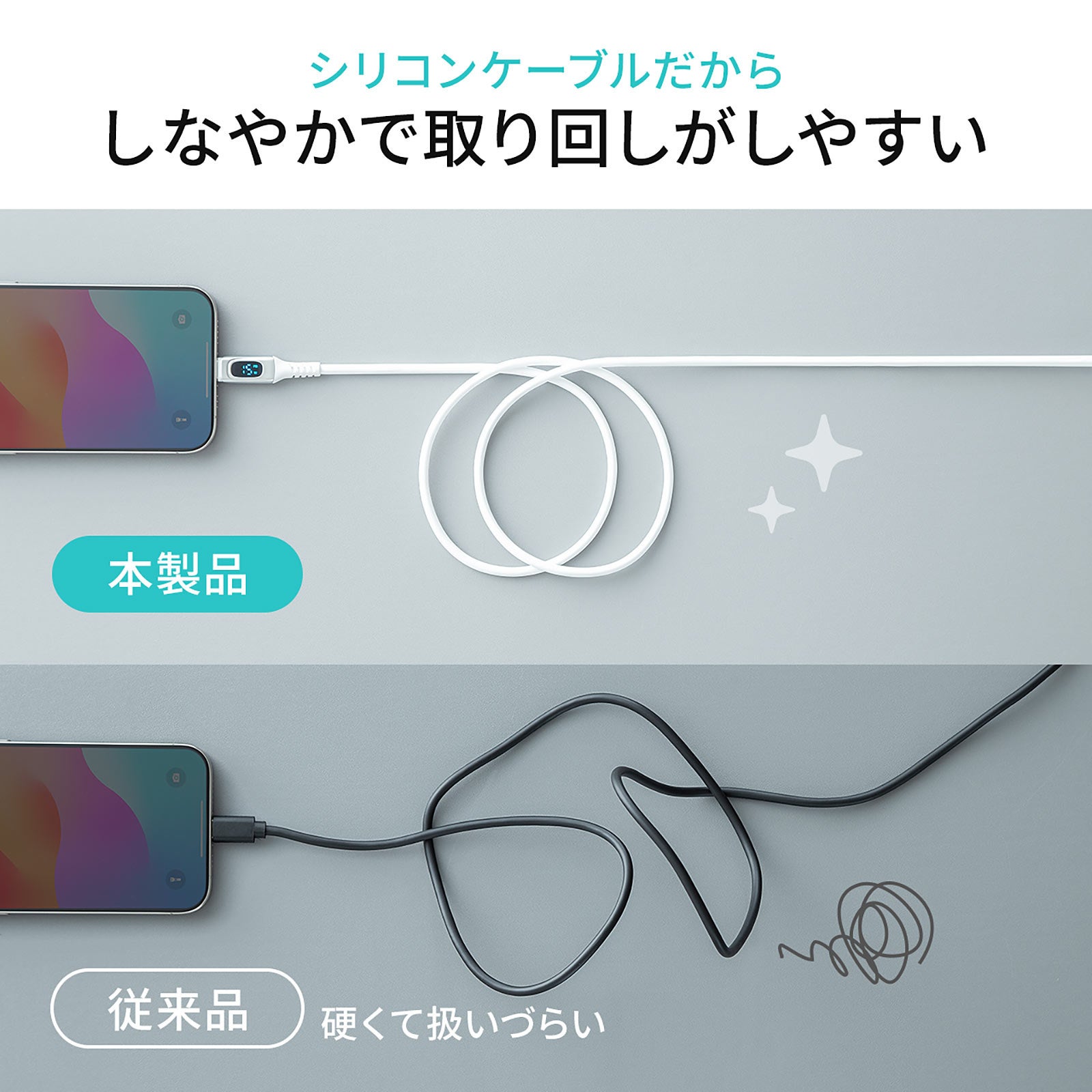 PD電力表示機能付き USB Type-Cケーブル USB PD240W対応 e-marker搭載 1m やわらかシリコンケーブル USB2.0 充電 データ転送 スマホ タブレット ホワイト
