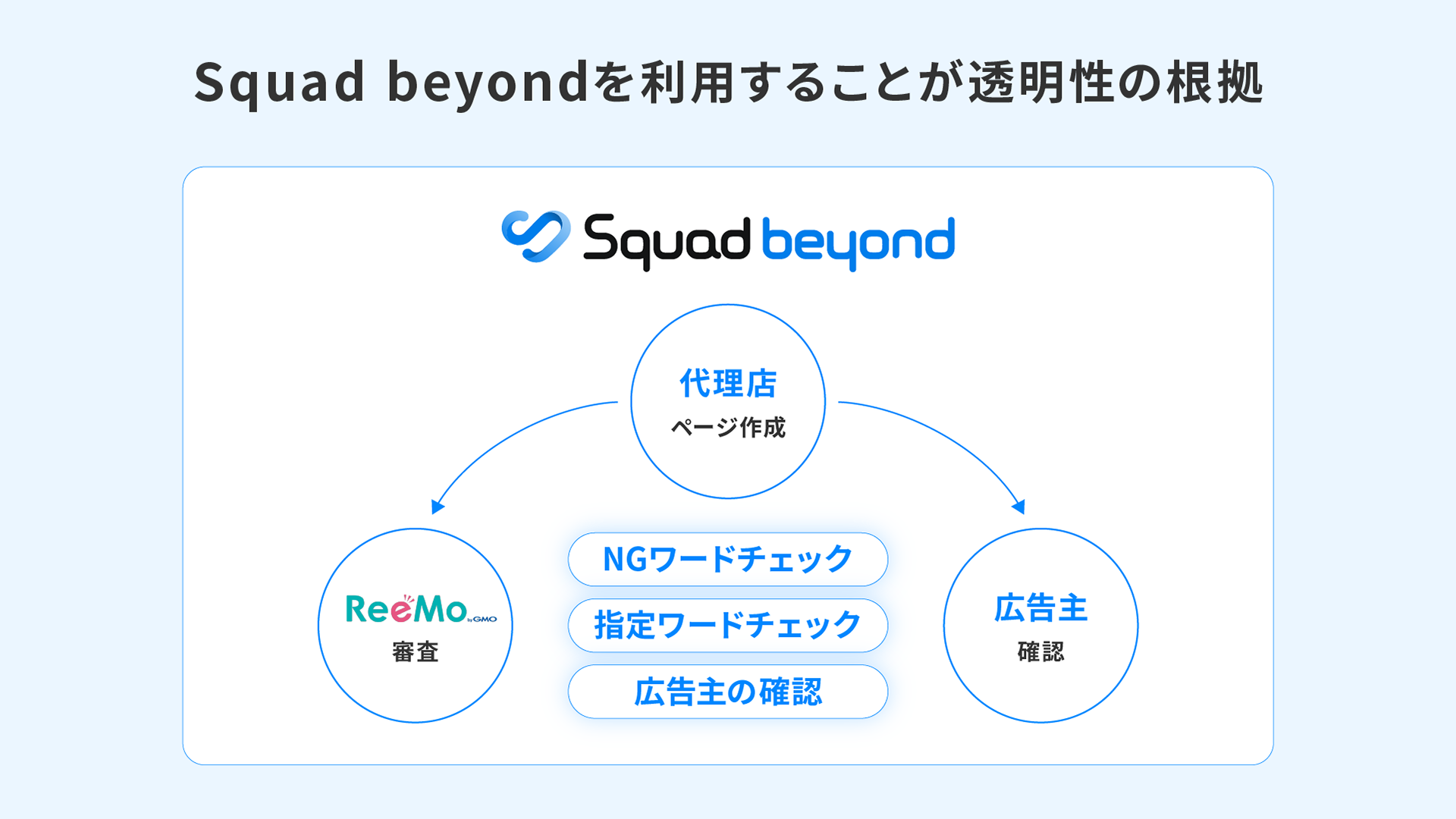 連携により、「Squad beyond」上で作成された全てのランディングページが「ReeMo byGMO」での広告配信前に自動で審査され、広告主と広告代理店は表現の確認作業の負担を削減しつつ、不適切な表現を未然に防ぐことができるようになります。
