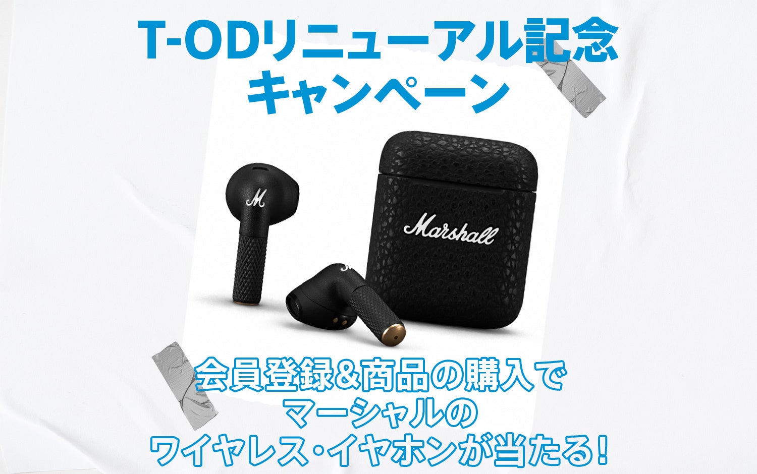 このキャンペーンは2022年3月10日(木)~2022年5月10日(火)の間に、T-ODで会員登録と商品を購入していただいた方の中から、抽選で8名様にマーシャルのワイヤレス・イヤホン“マイナーⅢ”をプレゼントするという内容。