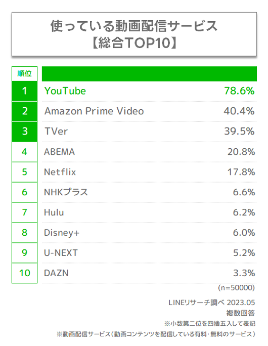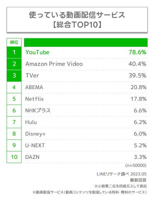 【LINEリサーチ】ふだん使っている動画配信サービスは「YouTube」が8割弱で1位、2位以降は「Amazon Prime Video」「TVer」が4割前後と僅差で続く結果に