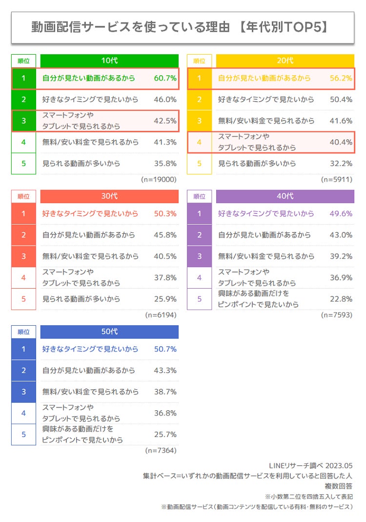 年代別にみると、すべての年代で「好きなタイミングで見たいから」「自分が見たい動画があるから」が上位となりました。「自分が見たい動画があるから」は10代と20代で6割前後と高くなり、「スマートフォンやタブレットで見られるから」も4割超となりました。また、ランキングには入りませんでしたが、10代と20代では「自分の部屋でひとりで見たいから」が2割台と他の年代に比べて割合が高めでした。
