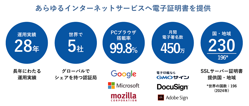 グローバルでシェアを持つ世界トップ5社(※4)の中で唯一の国産認証局「GlobalSign」を保有しており、国内外の主要な電子契約・署名ベンダーへ認証技術を提供しています。また自社開発で導入企業数350万社以上(※5)の「電子印鑑GMOサイン」との連携により、コストパフォーマンスの高いセキュアなサービスを多くの自治体・企業様等にご利用いただいております。