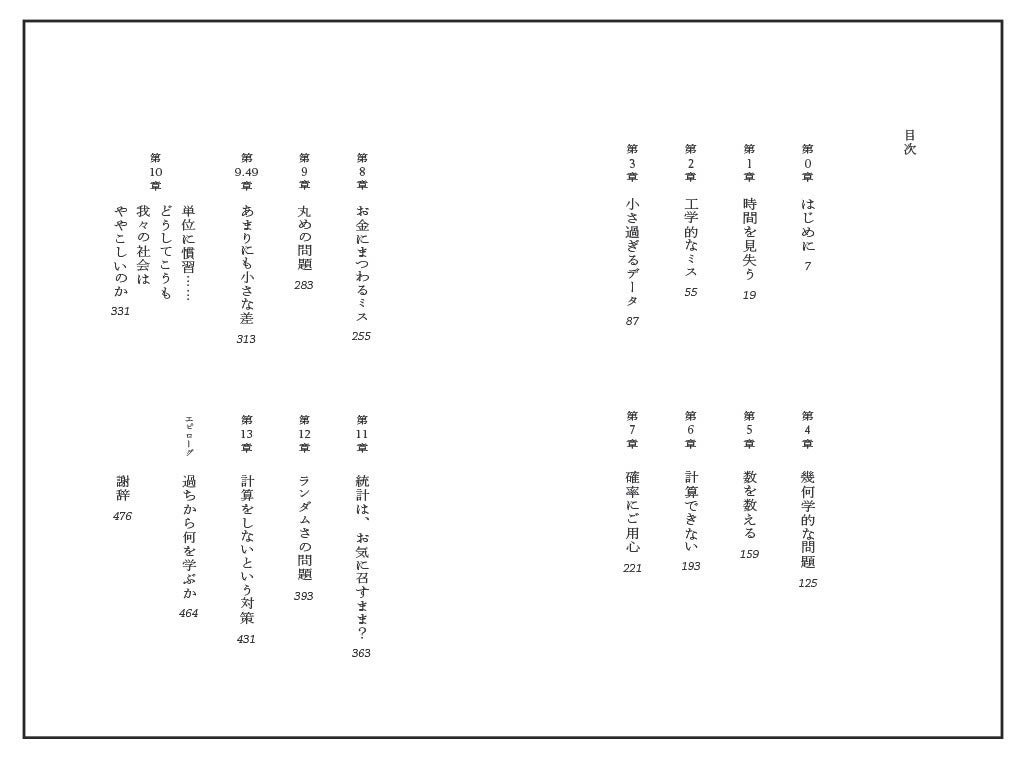 大事故寸前で切り抜けられた例もあれば、大惨事になってしまった例もある。そこには、インターネット、ビッグデータ、選挙、道路標識、宝くじ、オリンピック、古代ローマの暦など、実にさまざまなものがかかわっている。ページをめくれば、数学のミスがいかに恐ろしいか、世の中で数学がいかに重要な地位を占めているかがよくわかるだろう。
