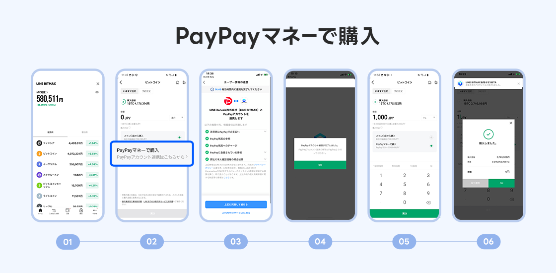 ユーザーは、「PayPayマネーで購入」もしくは「PayPayへの出金」からアカウント連携に進むことができます。PayPayマネーの残高があれば別途入金手続きを行わずに、「LINE BITMAX」で1円から24時間365日取引可能です(※4)。