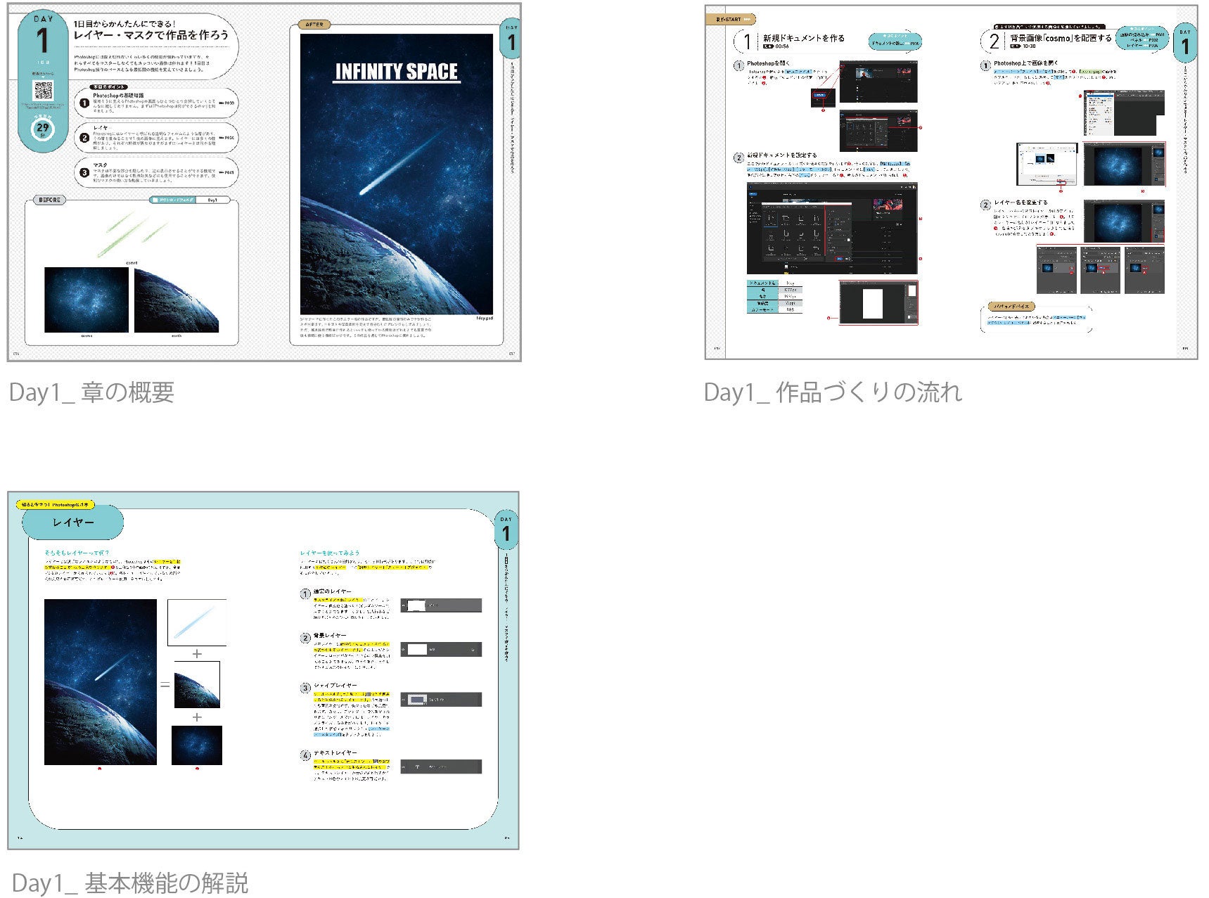 本書では機能をひとつひとつ解説するのではなく、ひとつの作品を完成させる流れの中で使う機能を解説していきます。よく使う基礎的なツールを中心に実践的にPhotoshopを学べるため、しっかりと制作力が身に付きます。作品が毎日完成する楽しさも感じられ、飽きずに続けられる内容です。練習用のデータもダウンロードできます。