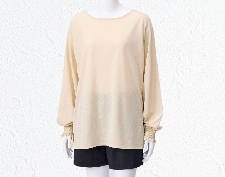 水着の上から着られる透け感のある梨地素材を使用しています。トップスとショートパンツの2セットです。