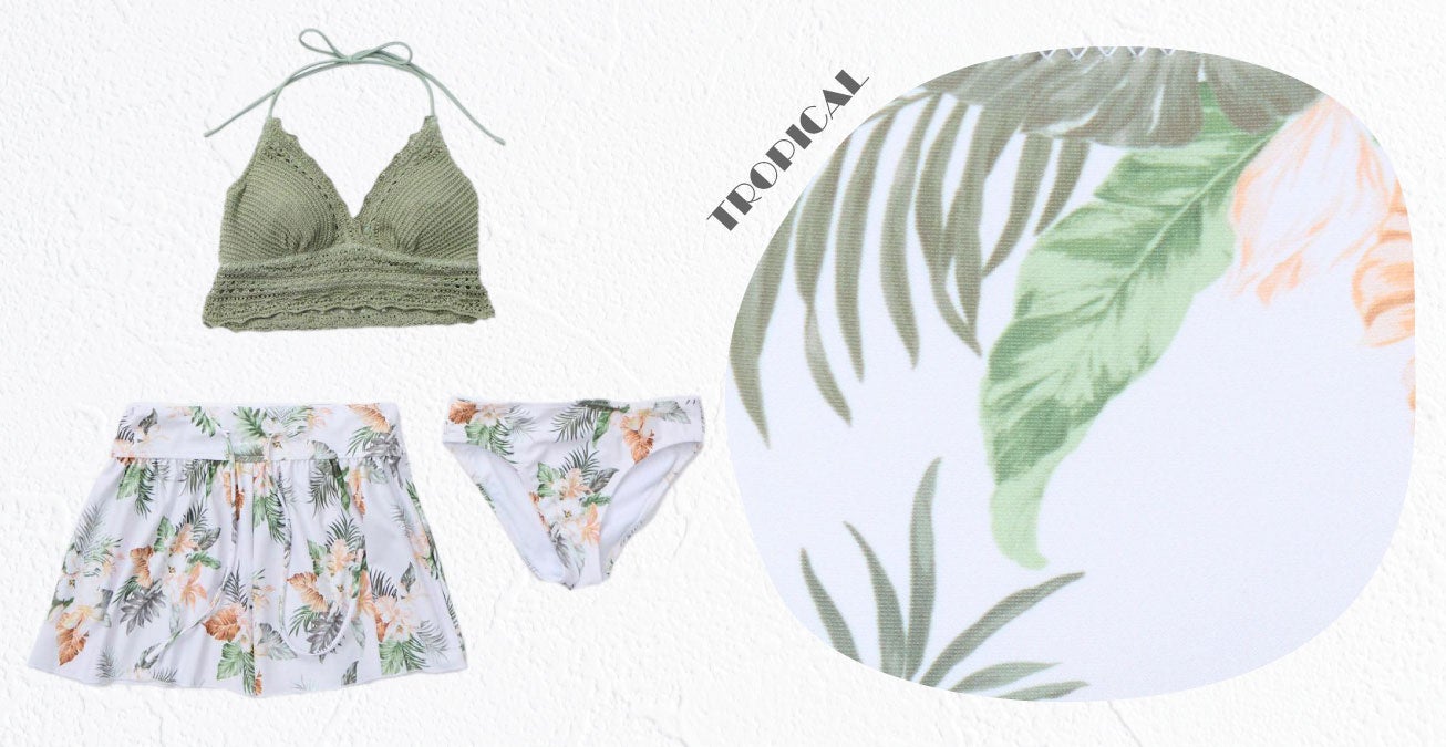 繊細な胸元のニットと花柄スカートが上品な印象のビキニです。ショーツとパンツは南国感のあるトロピカル柄です。