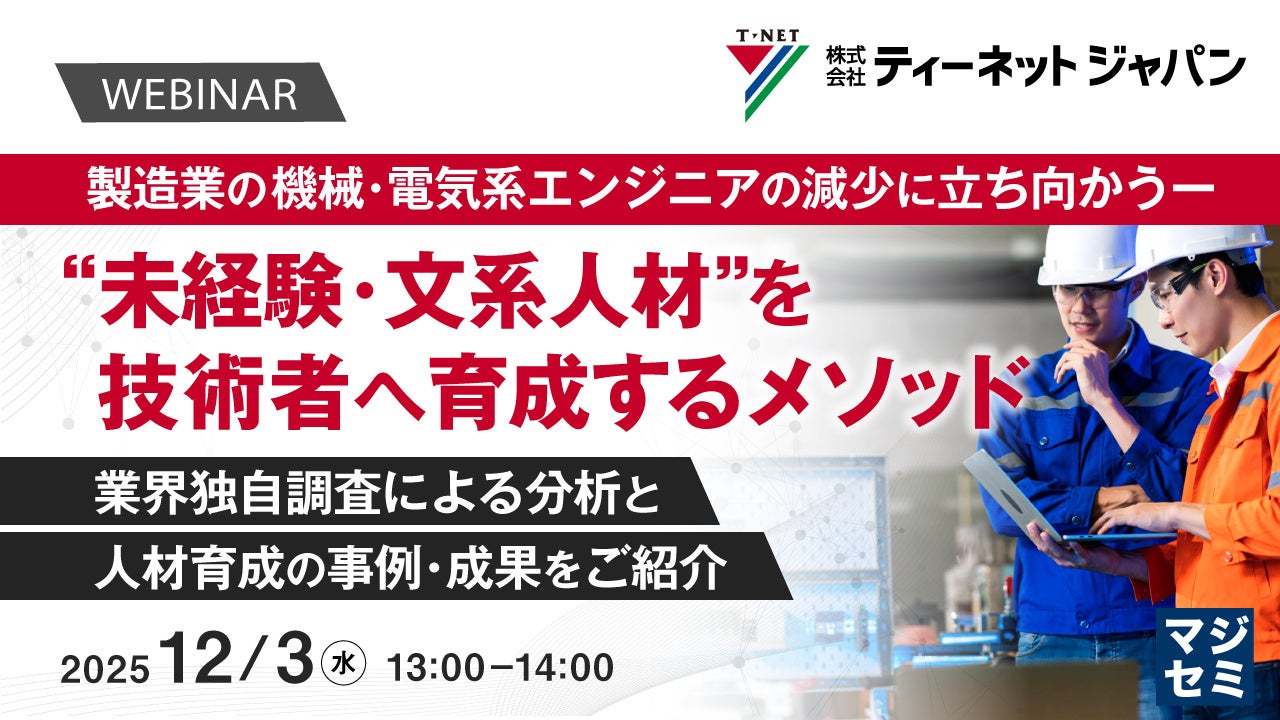 マジセミ株式会社は「製造業の機械・電気系エンジニアの減少に立ち向かうー “未経験・文系人材”を技術者へ育成するメソッド」というテーマのウェビナーを開催します。