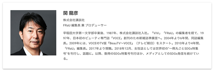スピーカーは、SDGsのリーディングメディア「FRaU」編集長 兼 プロデューサー 関龍彦。SDGsを発信する意義と効果について、3社の出稿事例をもとに考察します。ぜひご参加ください。