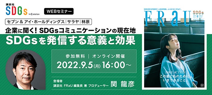 そのなかで、SDGsのリーディングメディア「FRaU」は、企業の"SDGsコミュニケーション"をパートナーとしてサポート。メディアとともにSDGsの発信する意義やメリットはどのような点にあるのか。「FRaU」に出稿実績のある3社へのオンライン取材を通して、「SDGsコミュニケーション」の現在地、課題と解決法を「FRaU」編集長 兼 プロデューサー 関龍彦とともに考えます。