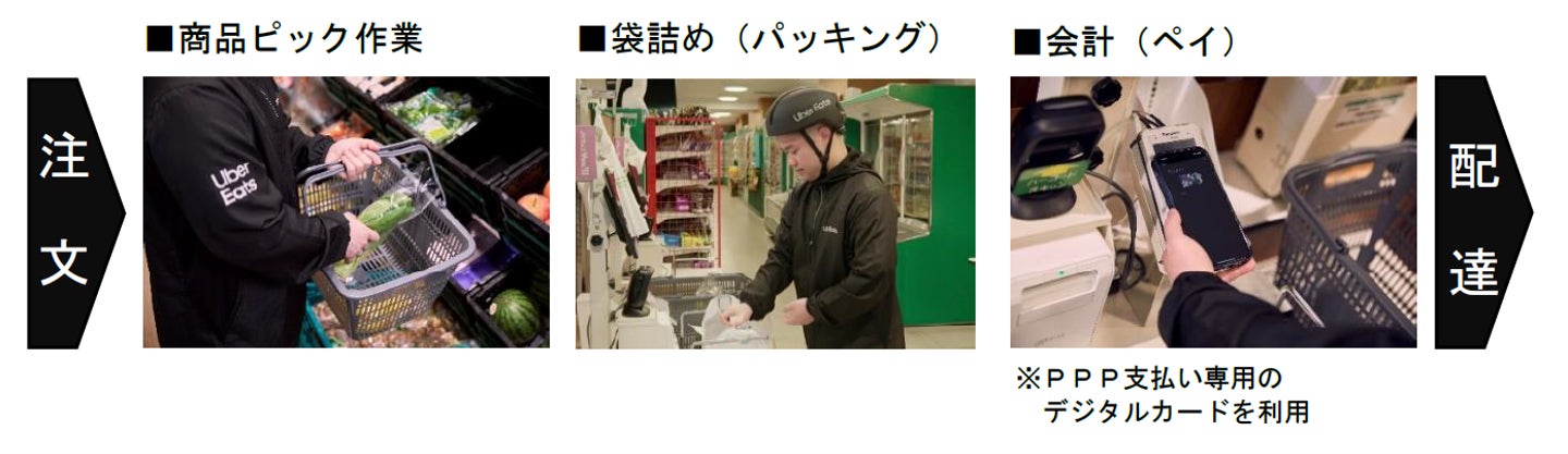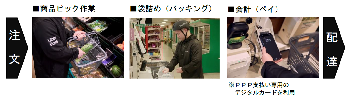 PPPは「Uber Eats」の配達パートナーが、注文商品のピック作業・袋詰めから会計・配達までを一貫して手掛ける機能です。