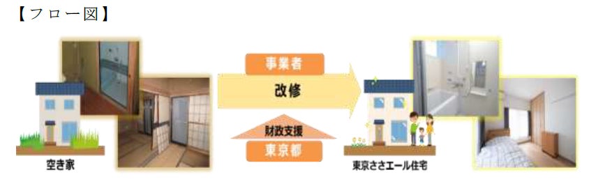 昨年度策定した「東京における空き家施策実施方針」を踏まえ、本年度から新たに、活用されていない空き家を東京ささエール住宅や子育て向けの住宅など、住宅政策の課題解決に繋がる用途に改修する取組を行う民間事業者等を支援する事業を実施します。